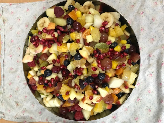 Im Anschluss daran wollten wir natürlich auch den Geschmack erleben und haben mit vorbereitender und unterstützender Hilfe der Eltern einen leckeren bunten Obstsalat gemeinsam zubereitet.