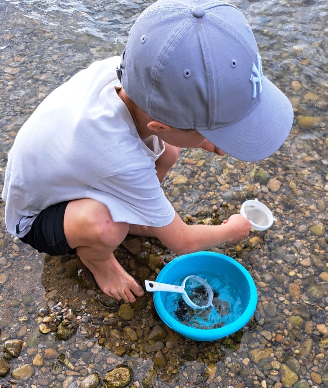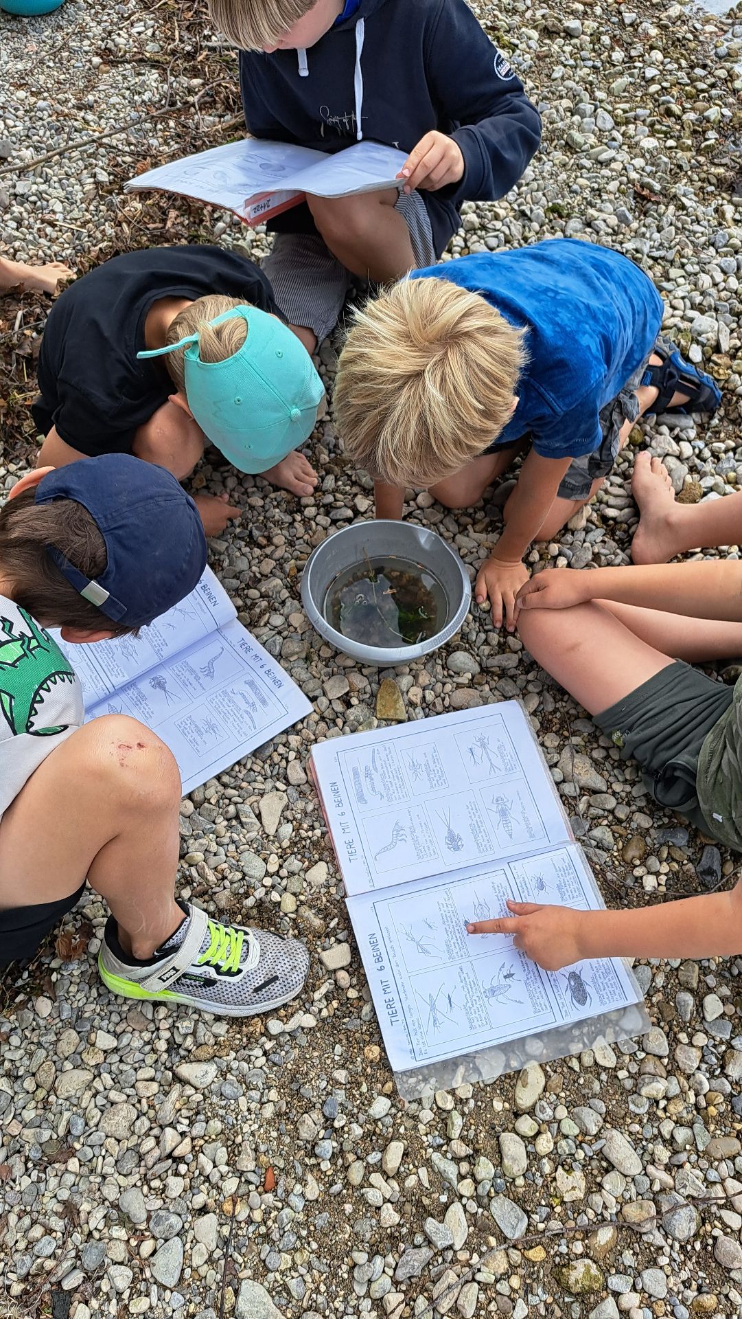 Am dritten Tag wurde mit Unterstützung der „Mobilen Umweltschule Pähl“ in der direkten Umgebung am Starnberger See im Wasser geforscht. Mit Fangnetzen wurden kleine Wassertierchen eingefangen und in Wasserschüsseln gesammelt. Unter dem Mikroskop konnten die Tiere bestimmt werden. Einige Schüler fischten und sammelten jedoch nicht nur Lebewesen, sondern auch Abfall und Plastik am Ufer und Unterwasser. Mit dem Umweltexperten wurde überlegt, wie wir das Wasser und seine Bewohner schützen können: „Wie können wir verhindern, dass Mikroplastik in die Umwelt und auf unseren Teller gelangt?“ – anschaulich mit einer Kette aus Steinen und einem Gemeinschaftsspiel wurde das Prinzip der Nahrungskette nachempfunden und den Schülerinnen und Schülern veranschaulicht.